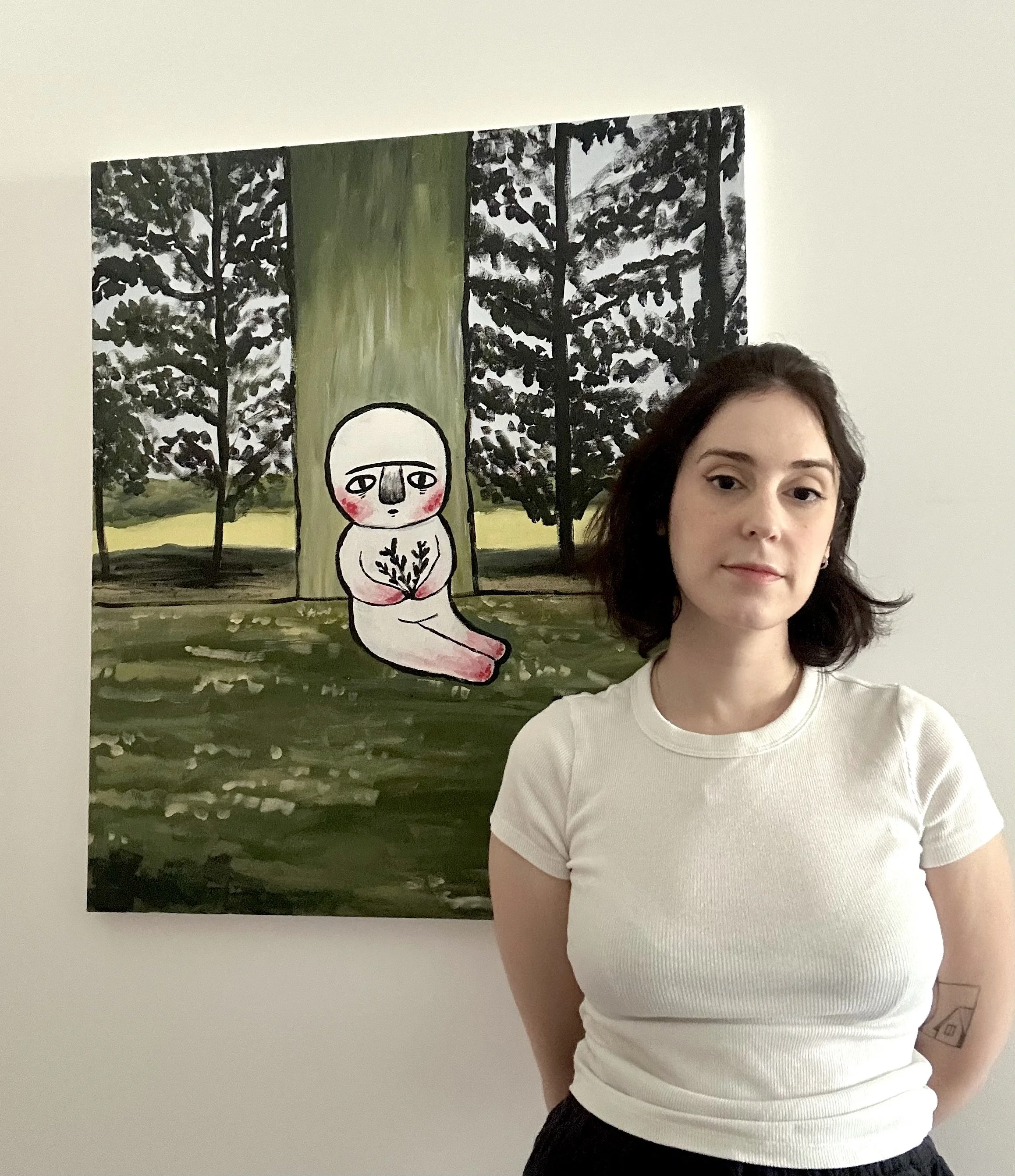 Luni / Ilana Portnoy is a visual artist whose work explores humanity as it exists before cultural definition. Born in Israel in 1995 to a family of immigrants from Belarus who fled following the Chernobyl disaster, she grew up between cultures - an experience that shaped her sensitivity to belonging and individuality. She earned a B.Des in Visual Communication from Shenkar College in 2020, where she created Luni: a recurring figure living in nature, stripped of social roles, religion, symbols, and imposed identities. Working through a reduced, symbolic, archetypal visual language, Portnoy seeks forms that can be read universally, beyond cultural, religious, or social frameworks. Set within natural landscapes, Luni is painted through a tension between classical figurative traditions and flat, symbolic form. The figures represent human states.